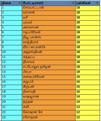 இன்றைய முதலாவது போட்டியில் முதலில் துடுப்பெடுத்தாடிய ஸ்கொட்லாந்து அணி, ஜோர்ஜ் முன்சீயின் அதிரடியான 84 (54 பந்துகளில்) ஓட்டங்களோடும், பிரெண்டன் மக்முல்லன் ஆட்டமிழக்காமல் வேகமாக எடுத்த 41 (18 பந்துகளில்) ஓட்டங்களுடனும் 4 விக்கெட்டுகளை இழந்து 207 ஓட்டங்களை அள்ளிக் குவித்தது. பதிலுக்குத் துடுப்பாடிய இத்தாலி அணியில் பென் மனென்டியின் 52 (31 பந்துகளில்) ஓட்டங்களைத் தவிர பிறர் சோபிக்காததால் 16.4 ஓவர்களில் சகல விக்கெட்டுகளையும் இழந்து 134 ஓட்டங்களை மாத்திரம் எடுத்தது. முடிவு: ஸ்கொட்லாந்து அணி 73 ஓட்டங்களால் வெற்றியீட்டியது ஸ்கொட்லாந்து அணி வெல்லும் எனக் கணித்த 18 பேருக்கு தலா இரு புள்ளிகள் கிடைக்கும். இத்தாலி அணி வெல்லும் எனக் கணித்த ஐவருக்குப் புள்ளிகள் இல்லை. இன்றைய இரண்டாவது போட்டியில் முதலில் துடுப்பெடுத்தாடிய ஓமான் அணி, மெதுவாக ஆடியதாலும் தொடர்ச்சியாக விக்கெட்டுகளை இழந்ததாலும் 19.5 ஓவர்களில் சகல விக்கெட்டுகளையும் இழந்து 103 ஓட்டங்களுடன் சுருண்டுகொண்டது. பதிலுக்குத் துடுப்பாடிய ஸிம்பாப்வே அணி பிரயன் பென்னிட்டின் ஆட்டமிழக்காமல் எடுத்த 48 (36 பந்துகளில்) ஓட்டங்களுடன் 13.3 ஓவர்களிலேயே 2 விக்கெட்டுகளை மாத்திரம் இழந்து 106 ஓட்டங்களை எடுத்து வெற்றி இலக்கை அடைந்தது. முடிவு: ஸிம்பாப்வே அணி 8 விக்கெட்டுகளால் வெற்றியீட்டியது ஸிம்பாப்வே அணி வெல்லும் எனக் கணித்த 21 பேருக்கு தலா இரு புள்ளிகள் கிடைக்கும். ஓமான் அணி வெல்லும் எனக் கணித்த இருவருக்குப் புள்ளிகள் இல்லை. இன்றைய மூன்றாவது போட்டியில் முதலில் துடுப்பெடுத்தாடிய தென்னாபிரிக்கா அணி எய்டன் மார்க்ரமின் அதிரடியான 59 (32 பந்துகளில்) ஓட்டங்களுடனும், டேவிட் மில்லர் ஆட்டமிழக்காது வேகமாக எடுத்த 39 (23 பந்துகளில்) ஓட்டங்களுடனும், ட்ரிஸ்டன் ஸ்டப்ஸ் ஆட்டமிழக்காமல் மின்னல் வேகத்தில் எடுத்த 34 (19) ஓட்டங்களுடனும் 4 விக்கெட்டுகளை இழந்து 213 ஓட்டங்களை அள்ளிக் குவித்தது. பதிலுக்குத் துடுப்பாடிய கனடா அணியில் நவ்னீத் தலிவால் மாத்திரமே 64 (49) ஓட்டங்களை எடுத்து ஆட்டத்தில் சோபித்தார். மற்றையோர் விரைவாக விக்கெட்டுகளை இழந்ததால் இறுதியில் 8 விக்கெட்டுகளை இழந்து 156 ஓட்டங்களை மாத்திரமே எடுக்கமுடிந்தது. முடிவு: தென்னாபிரிக்கா அணி 20 ஓட்டங்களால் வெற்றியீட்டியது அனைவரும் தென்னாபிரிக்கா அணி வெல்லும் எனக் கணித்தமையால் தலா இரு புள்ளிகள் கிடைக்கும். இன்றைய மூன்று போட்டிகளின் முடிவின் பின்னர் யாழ்களப் போட்டியாளார்களின் நிலைகள்: நீங்கள் மட்டும்தான் தெரிவு செய்யவில்லை. இப்போது தெரிவு செய்தாலும் சேர்த்துக்கொள்ளப்படும் 😁