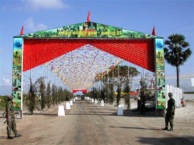 A9, Jaffna-Kandy highway decorated with read and yellow flags and cut outs at the Elephantpass memorial site in early morning on Martyr's day.jpg