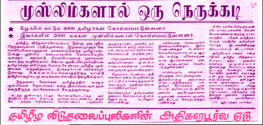 முஸ்லீம்கள் தமிழ் மக்கள் மீது கட்டவிழ்த்துவிட்ட கொடுமைகளால்.. 2000 தமிழ் மக்கள் கொல்லப்பட்டு 4 இலட்சம் பேர் அகதிகளாக்கப்பட்டுள்ளனர். பல பெண்கள் முஸ்லிம் காடைகளால் பாலியல் வல்லுறவுக்கு உள்ளாகி உள்ளனர். இவை நடந்தது 1990 களில்.