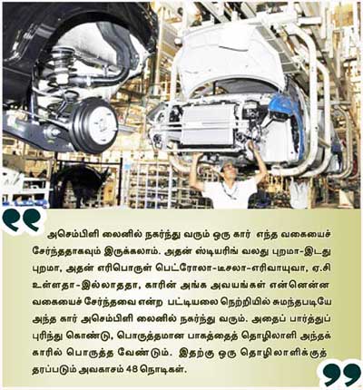 மாருதி சுசுகி காரின் 4 மாடல்களுடைய 180 வேறுபட்ட வடிவங்கள் இந்த ஆலையில் உற்பத்தி ஆகின்றன. அசெம்பிளி லைனில் நகர்ந்து வரும் ஒரு கார் இந்த 180இல் எந்த வகையைச் சேர்ந்ததாகவும் இருக்கலாம். அதன் ஸ்டியரிங் வலது புறமாஇடது புறமா, அதன் எரிபொருள் பெட்ரோலாடீசலாஎரிவாயுவா, ஏ.சி உள்ளதாஇல்லாததா, 32 வகை இருக்கைகளில் என்ன ரகம், 90 வகை டயர்கள் மற்றும் வீல் அசெம்பிளிகளில் எந்த வகை, கதவுகள், பூட்டுகள், கியர் பாக்ஸ்கள் போன்ற காரின் அங்க அவயங்கள் என்னென்ன வகையைச் சேர்ந்தவை என்ற பட்டியலை நெற்றியில் சுமந்தபடியே அந்த கார் அசெம்பிளி லைனில் நகர்ந்து வரும். அதைப் பார்த்துப் புரிந்து கொண்டு, பொருத்தமான பாகத்தை தொழிலாளி அந்தக் காரில் பொருத்த வேண்டும். இதற்கு ஒரு தொழிலாளிக்குத் தரப்படும் அவகாசம் 48 நொடிகள்.