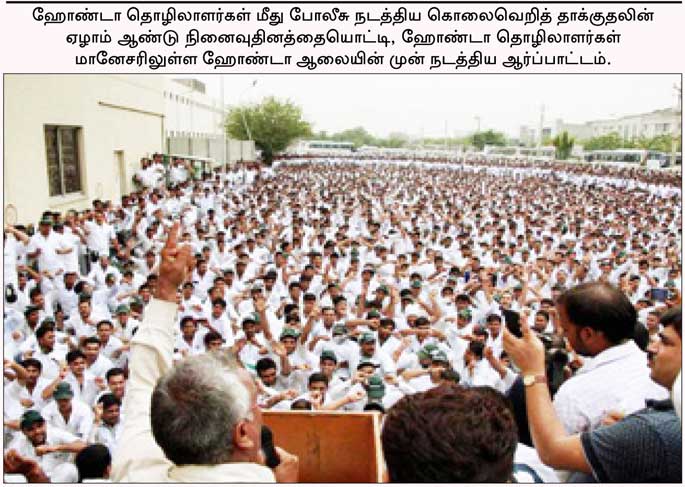 துரோகிகளும் அடிமைகளும் வன்முறையின் ஆபத்து குறித்து தொழிலாளி வர்க்கத்தை எச்சரிக்கிறார்கள். அகிம்சை வழியில் நடக்குமாறு அறிவுரை வழங்குகிறார்கள். ஏழு ஆண்டுகளுக்கு முன் அகிம்சை வழியில் தொழிற்சங்க உரிமை கேட்டுப் போராடிய ஹோண்டா தொழிலாளர்களை இரத்தத்தில் குளிப்பாட்டியது அரியானா போலீசு. ஆனால், கொலைமுயற்சி குற்றம் சாட்டப்பட்டு 63 தொழிலாளர்கள் தான் இன்று வரை கோர்ட்டுக்கு நடந்து கொண்டிருக்கிறார்கள். ஒரு போலீசுக்காரன் மீதோ, மானேஜர் மீதோ எந்த வழக்கும் இல்லை. 3 ஆண்டுகளுக்கு முன் இதே குர்கானில் அஜித்சிங் என்ற தொழிலாளியை ஆள் வைத்துக் கொன்ற முதலாளிகள் சுதந்திரமாக நடமாடிக் கொண்டிருக்கிறார்கள். கொலை வழக்கு தூங்குகிறது.