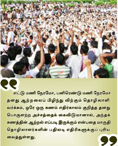 பேயறைந்து வெளிறிப்போன ஆளும் வர்க்கத்தின் முகத்தைத் தரிசிப்பதற்கான அரியதொரு வாய்ப்பை ஏற்படுத்திக் கொடுத்ததற்காக மாருதி தொழிலாளர்களுக்கு நன்றி சொல்லக் கடமைப் பட்டிருக்கிறது இந்தியத் தொழிலாளிவர்க்கம்.