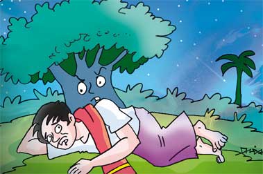 நண்பகல் நேரம். வெயில் சுள்ளென்று அடித்துக்கொண்டிருந்தது. மரத்தின் அடியில் ஒருவன் படுத்து நன்றாகத் தூங்கிக் கொண்டிருந்தான். வெயில் அவன் மீது பட்டுக்கொண்டிருந்தது.
