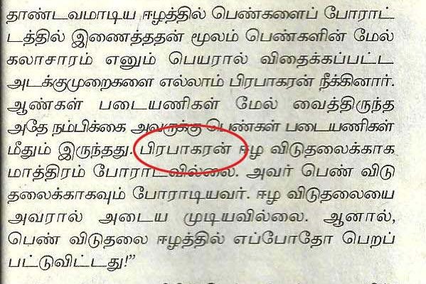 விடுதலைப்புலிகள் இயக்கத்தின் தலைவர் பிரபாகரனை பொதுவாகப் புகழ்வது போல் தோன்றினாலும் ஈழப் போராட்டத்தின் தோல்வியை மிக மோசமான ஒப்பீடுகளுடன் விமர்சிக்கிறது.வன்மம் தோய்ந்த வார்த்தைகளால் அவதூறு செய்கிறது.