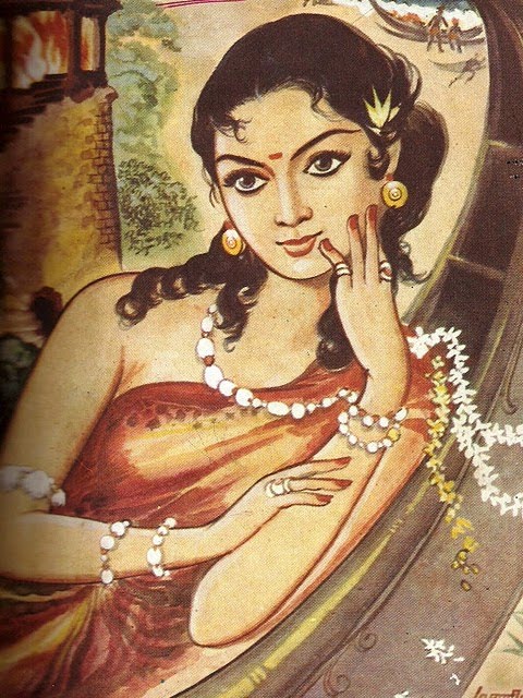 "அவ்வளவு ஸ்திரீகளிலும் பழுவேட்டரையரின் இளைய ராணி தான் பிரமாத அழகுடன் விளங்கினாள்! மற்ற கருநிறத்து மங்கையர்க்கு நடுவில் அந்த ராணியின் முகம் பூரண சந்திரனைப் போல் பொலிந்தது. அரம்பை, ஊர்வசி, திலோத்தமை, இந்திராணி, சந்திராணி எல்லோரும் அவளுக்கு அப்புறந்தான்!"