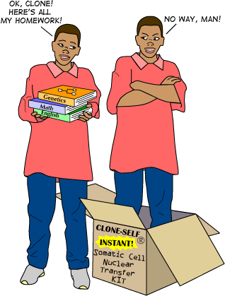 instantclones.gifஇனிவரும்காலத்தில் கண்டிப்பாக இந்த குளோனிங் நடைமுறைக்கு வரத்தான் போகிறது இப்போது இல்லை என்று சந்தோசபட்டா லும் எதாவது சில நாடுகள் இதில் எதாவது சாதனைகள் செய்ய ஆரம்பித்தால் மற்றைய நாடுகளும் ஆரம்பித்துவிடும் சட்டங்கள் மாற்றப்படும்.