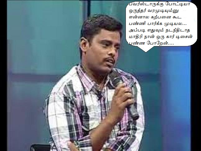 நமக்கு ஏற்கனவே பெரிய டாகுடர், சின்ன டாகுடர், சொம்பு, கரடி, சாம் ஆண்டர்சன், பவர்ஸ்டார், வீரத்தளபதி என்று பல ஆஸ்த்தான நாயகர்கள் இருக்கிறார்கள். அந்த வரிசையில் வந்துள்ள இந்த புரட்சி நடிகரை எப்படிப் பெயர் வைத்து அழைக்கலாம் என்று கருத்து கூறுங்கள் நண்பர்களே... உங்களுக்கு ஐந்து சாய்ஸ்கள் கொடுக்கப்பட்டுள்ளன. ஏதாவது ஒன்றைத் தேர்ந்தெடுத்துக் கொள்ளலாம்.