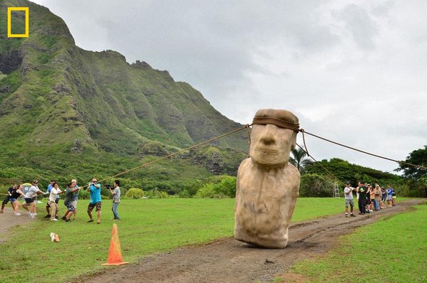 12 அடி உயரமுள்ள 5டன் மோய் சிலையை, இக் குழு படத்தில் உள்ளது போல் மூன்று நீண்ட கயிறுகள் சிலையின் தலையில் கட்டப்பட்டு சிலையின் பின்புரம், பக்கவாட்டின் இருபுறமும் ஏற்படுத்தும் அசைவுகள் இந்த சிலையை பல மீட்டர்கள் தூரத்திற்கு உருளைகள் இன்றி நகர்த்தி காட்டியது.