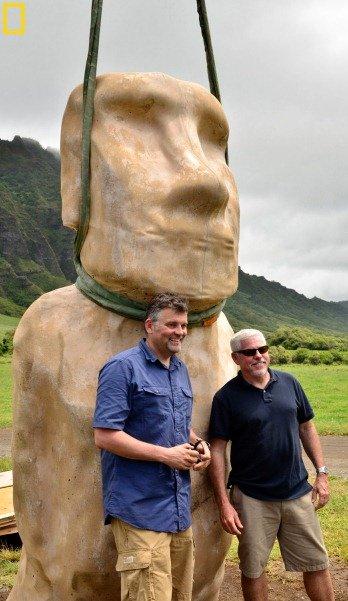 ஹவாய் பல்கலைகழகத்தை சேர்ந்த பேராசிரியர் டெரிகன்ட் என்பவரும், கலிபோர்னிய மாகாண பல்கலைகழகத்தை சேர்ந்த பேராசிரியர் கார்ல் லிப்போ மற்றும் தொல்லியல் ஆய்வாளர் சர்ஜிகோ ராபு இவர்கள் 12 ஆண்டுகால தொடர் ஆய்வின் இறுதியில் கற்சிலைகள் இப்படித்தான் நிறுவப்பட்டிருக்கும் என்ற முடிவிற்கு வந்ததோடு 18 பேர்களை கொண்டு செயல்படுத்தியும் காட்டினர். (இதற்கு முன் பல குழுக்கள் இது குறித்த உறுதியான முடிவை எட்ட வில்லை என்பதை கவனத்தில் கொள்ளவேண்டும்)