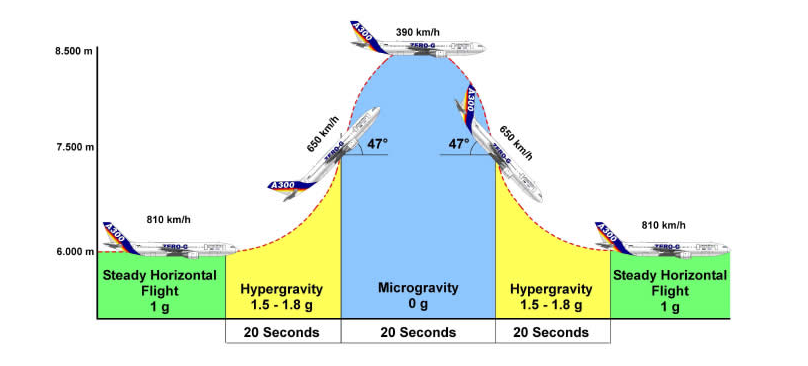 ZeroG.png விமானம் பரவளையப் பாதையில் மேலே உள்ளவாறு செல்லும்.  இதுபோல 15 முதல் நாற்ப்பது முறை மேலும் கீழுமாக விமானம் பறந்து செல்லும். முகட்டை அடையும்போது ஒவ்வொரு முறையும் ஒரு விதமான எடையை உணரும் வண்ணம் விமானத்தை செலுத்துவார்கள்.  எடையற்ற தன்மை மட்டுமல்ல, செவ்வாய் கிரகம், நிலவு ஆகியவற்றில் நிலவும் ஈர்ப்பு விசையையும் உணரும் வண்ணம் விமானம் செலுத்தப் படும்.
