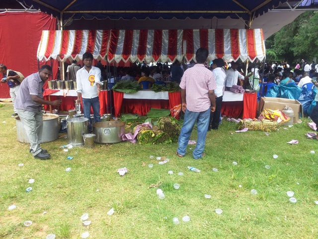 சாப்பாட்டிற்காக 300 ஆடுகளை வைகுண்டத்திற்கு நேற்றைக்கே அனுப்பிவைத்துவிட்டதாக ஒரு இணை இயக்குநர் என்னிடம் சொல்லியிருந்த்தால் நானும் இதைத்தான் எதிர்பார்த்திருந்தேன். 200 நபர்களை வேலைக்கு வைத்து பல வேலைகளை செய்து கொண்டிருந்தாலும் நாம் தமிழர் கட்சித் தம்பிமார்கள்தான் சோற்றுத் தட்டைத் தூக்கிக் கொண்டு வந்தார்கள் என்பதை சொல்லித்தான் ஆக வேண்டும்..! முந்தைய தினமே சாப்பாட்டு வேலைகள் ஆரம்பித்து.. 3 ஷிப்ட்டாக நடந்து கொண்டிருந்தது.. நாங்கள் சாப்பிட்டு வெளியில் வரும்போதும் அடுத்த ஷிப்ட்டுக்காக சோறு வெந்து கொண்டிருந்தது..!