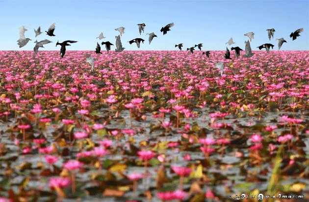 நீல வான் பரப்பில் நீந்திச் சென்ற இந்தப் நீர்ப் பறவைகளின் பரபரப்பிற்கு செவ்வாம்பல் மலர்கள் செய்த சதிதான் காரணமோ!! மென்மை உணர்த்தும் மலர்கள் வன்மையும் செய்யுமோ !!?? தனல் தணிக்கும் புனல் மீது அனலை அள்ளித் தெளித்தது யார் ?