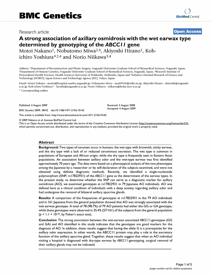 நாற்றமற்ற வியர்வையுள்ளவரின் அதே மாற்றமுற்ற ABCC11 மரபணு இருக்கிறதாம்.