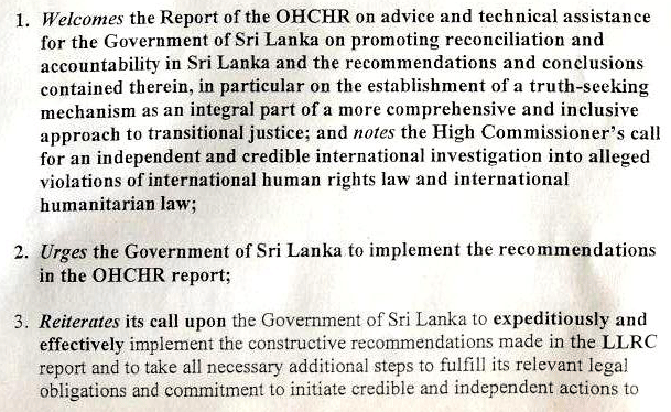 1. இலங்கை அரசு அமைத்த எல்.எல்.ஆர்.சி மற்றும் அதனை செயல்படுத்துவதற்கான தேசிய செயல்திட்டம் ஆகிய இரண்டுமே பன்னாட்டு சட்டங்களின் கீழான பொறுப்புகளை நிரைவேற்ற போதுமானவை அல்ல என்று இந்த தீர்மானம் கவலை தெரிவித்துள்ளது.