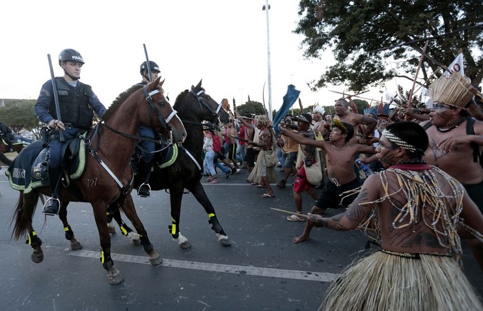 பிரேசிலின் பழங்குடி மக்களும் இந்த போராட்டத்தில் இணைந்துள்ளனர். தங்களின் நிலஉரிமைக்கு எதிராக பிரேசில் நாடாளுமன்றத்தில் தாக்கல் செய்யப்பட்டுள்ள மசோதாவை திரும்ப பெற வலியுறுத்தி,ஏற்கனவே தொடர்ச்சியான பல போராட்டங்களில்  ஈடுபட்டு வந்தார்கள். இந்நிலையில் தலைநகர் பிரேசிலியாவில் கட்டப்பட்டிருக்கும் புதிய மைதானத்தில் உலக கோப்பையை காட்சிக்கு வைக்கும் தினத்தில் வில் அம்புகளுடன் மைதானத்தை முற்றுகையிட்டு போராட்டத்தில் ஈடுபட்டனர். இவர்களுடன் உலககோப்பை எதிர்ப்பாளர்களும் இணைந்து கொண்டனர். மைதானத்தை நோக்கி முன்னேற முயன்ற  இவர்கள் மீது கண்ணீர்புகை குண்டுகளை வீசி கலைக்கமுயன்றனர் போலீசார். பதிலுக்கு பழங்குடி மக்களும் போலீசார் மீது வில் எய்ததால் இரு தரப்பிற்கும் இடையில் மோதல் மூண்டது. இதில் அம்பு தைத்து ஒரு   போலீசார் உள்ளிட்ட பலர் காயமடைந்தனர்.