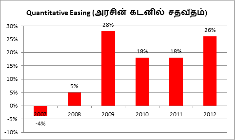 அங்குதான் பிரச்சனையின் பரிமாணம் மிக பெரிய அளவில் அதிகரிக்கிறதுநமக்கு கடன் வாங்கமற்றும் பிற பொருளாதார பரிவர்த்தனைகள் செய்ய வங்கியாளர்கள் இருப்பது போல்அரசங்கத்துக்கும்நாட்டிற்கும்   ஒரு வங்கி உள்ளதுஅது தான் இந்திய ரிசர்வ் வங்கிஅதுநாட்டின் பண புழக்கம்பண வீக்கம்வட்டிவிகிதம்வங்கித்துறை மற்றும் நாணய மாற்று விகிதம்போன்றவற்றை கட்டுபடுத்துகிறதுஇந்த நிறுவனத்துக்கு உள்ள மிக பெரிய அதிகாரம்பணத்தைதானே அச்சடிக்கலாம்.இது போல அரசாங்கம் கட்டுக்கடங்கா கடன் பிரச்ச்னையை ஏற்படுத்தும்போது மத்திய ரிசர்வ் வங்கி தன் செயல்பாட்டை தொடங்க ஆரம்பிக்கும்திறந்த சந்தைபரிவர்த்தனை (Open Market Operation) மூலம் சந்தையில் உள்ள அரசாங்க கடன் பத்திரங்களைவாங்க ஆரம்பிக்கும்இதற்கு ஆங்கிலத்தில் Quanitative Easing என்று சொல்வார்கள்அரசாங்கத்தின்கடனை காப்பீட்டு நிறுவனங்கள் வாங்கும் போது மக்கள் காப்பீடு செய்வதற்கு மாதா மாதாம்கொடுக்கும் பணத்திலிருந்து வாங்குவார்கள்மற்ற பரஸ்பர நிதி நிறுவனங்கள் தனதுமுதலீட்டாளர்களின் பணத்தை கொண்டு வாங்கும்மிக பெரிய கடனை வாங்கும் அளவு பணம்மத்திய ரிசர்வ் வங்கிக்கு எப்படி வரும் என்று யோசிக்கிறீர்களா?கடனை வாங்க  பணத்தை பெறரிசர்வ் வங்கி  கடின படவில்லைதாங்களே அச்சிட்டு கொள்ளலாம்அது தற்போதையகம்ப்யூட்டர் யுகத்தில் அச்சிட பேப்பருக்கு கூட செலவு செய்ய வேண்டியதில்லைகணிணிமென் பொருளில் ஒரு சில என்ட்ரிக்கள் போட்டால் மட்டும் போதும்பணம் தயாராகி விடும்.