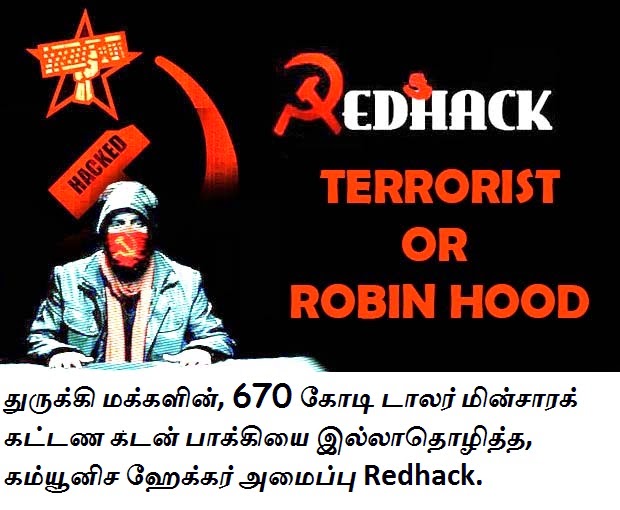 துருக்கியில் ரொபின் ஹூட் பாணியில் இயங்கும், கம்யூனிச ஹேக்கர் அமைப்பான ரெட் ஹேக், கோடிக் கணக்கான டாலர் மின்சாரக் கடன் பாக்கியை அழித்து விட்டுள்ளது. (http://www.techworm.net/2014/11/redhack-hacks-turkeys-electric-distribution-company-website-delete-bills-worth-1-5-trillion-turkish-lira.html)