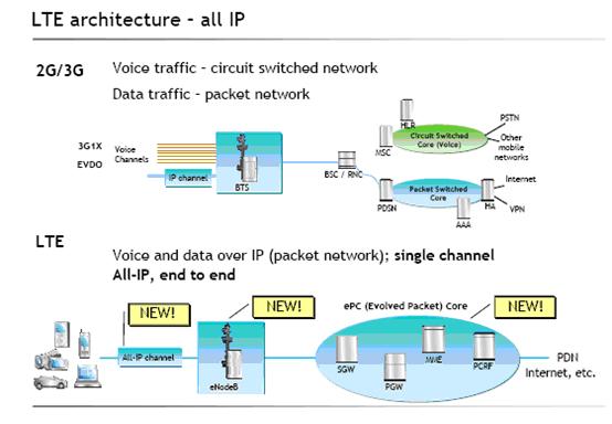 2G மற்றும் 3G தொழில்நுட்பத்தில் நாம் பேசும் பேச்சுகளை (Voice) கடத்தி செல்வதற்கு சுற்றமைப்பு விசைமாற்றி (Circuit Switching) என்ற தனி கட்டமைப்பு. இணைய (Internet) சேவைகளை வழங்க தகவல் பெட்டக விசைமாற்றி (Packet Switching)என்ற தனி கட்டமைப்பு. ஆனால் 4G தொழில்நுட்பத்தில் இரண்டிற்கும் சேர்த்து ஒரே கட்டமைப்புதான். அதாவது 2G/3Gகட்டமைப்பில் ஒரு இடத்திலிருந்து இன்னொரு இடத்திற்கு நாம் பேசுவது (குரல்) ஒரு பாதை வழியாகவும், இணைய சேவைகள் (E-mail, Web Browsing) இன்னொரு பாதை வழியாகவும் நம் செல்பேசியை வந்தடைகிறது. உதாரணமாக சென்னையிலிருந்து தஞ்சாவூருக்கு குரல் ரோடு வழியாகவும், இணைய சேவை ரயில் பாதை வழியாகவும் வந்து சேருகிறது. 4Gதொழில்நுட்பத்தில் நாம் பேசும் பேச்சுகள் எல்லாம் Voice over IP என்ற தொழில்நுட்பத்தின் வழியாக தகவல் பெட்டக (Packet) முறையில் கடத்தி செல்லப்படுகிறது. சென்னையிலுருந்து தஞ்சாவூருக்கு குரல், இணைய சேவைகள் இரண்டும் ஒரே ரயில் பாதையில் வந்து சேருகிறது. கீழேயுள்ள படத்தை பாருங்கள். தெளிவாக புரியும்...LTE (Long Term Evolution) என்பது 4G கட்டமைப்பின் ஒரு பகுதி.