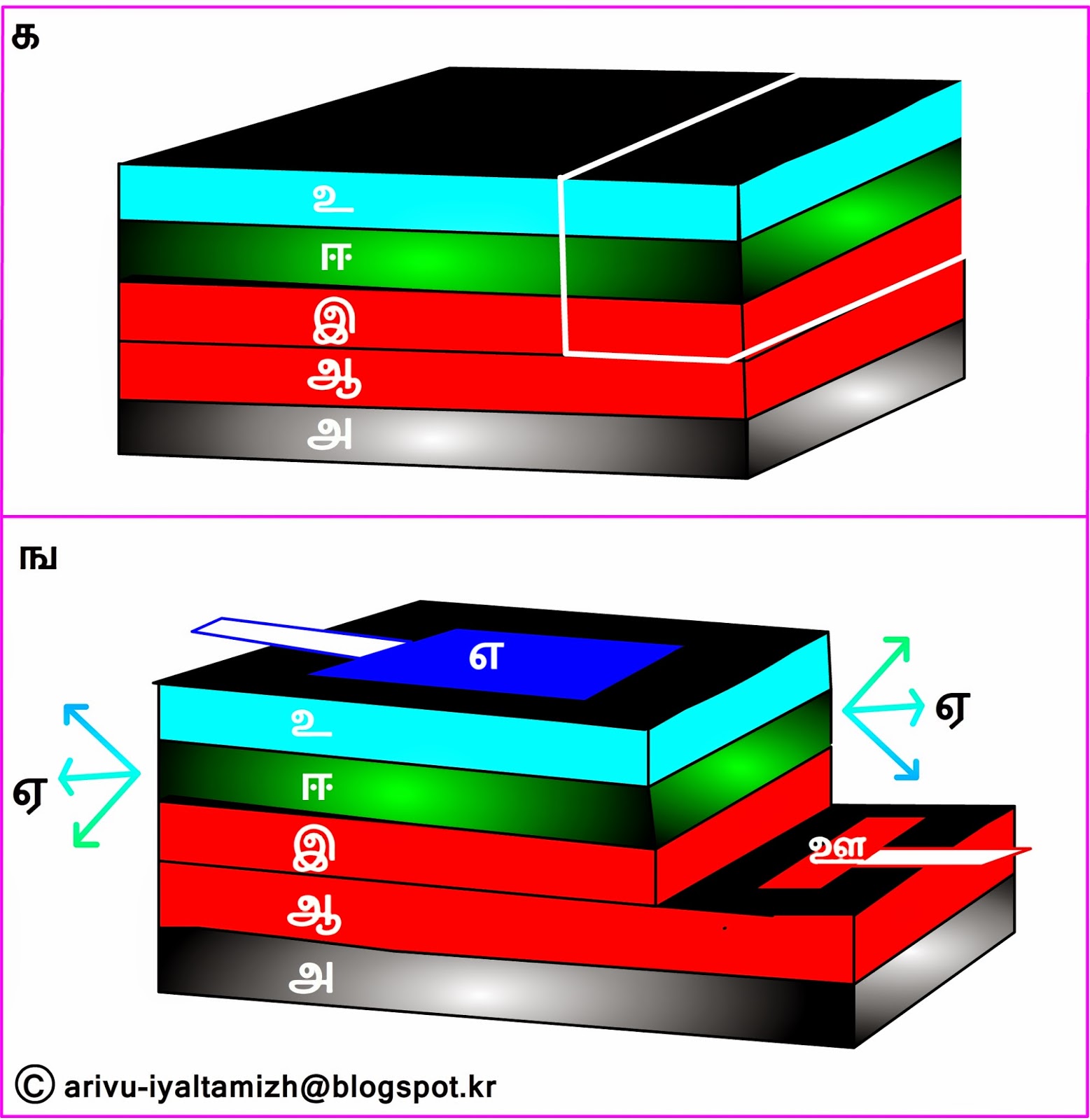 சரியான அடித்தள மூலக்கூறினை (படம் 2அ) தரவுசெய்தபின், அதன் மீது அதிநுண்ணிய அதாவது நானோமீட்டர் அளவில் n-வகை குறைகடத்தியாலான அடுக்கு (படம் 2ஆ) உருவாக்கப்படுகிறது. இதன் மீது மேலும் அதேபோன்றதொரு அடுக்கை உருவாக்கியபின் (படம் 2இ), ஒளிஉமிழ்வு நிகழ்த்தப்படும் பல்லடுக்குகளை கொண்ட ‘செயல்படும் பகுதி (quantum wells)’ (படம் 2ஈ) நிர்ணயிக்கப்படுகிறது. இப்பகுதியின் மீது p-வகை குறைகடத்தியாலான அடுக்கு (படம் 2உ) உருவாக்கப்பட்டு அதனை மின்னோட்டத்துடன் இணைக்கும் பொருட்டு, உலோகத்தாலான கடத்தி (படம் 2எ) அதனுடன் பொருத்தப்படுகிறது. இந்த மண்ணடுக்கு போன்ற அமைப்பு, ஒரு p-n சந்தி பொல செயல்படுகிறது. இதில் எதிர்மின்னயணி p-சந்தியிலிருந்து, n-சந்திக்கு கடத்தப்படவேண்டும், அதன்பொருட்டு படம் 2க-வில் வெள்ளை நிற கட்டத்தால் குறிக்கப்பட்டபடி, மிகவும் கவனமாக அந்த பகுதி துண்டிக்கப்படுகிறது (படம் 2ங). அப்படி துண்டித்தபின், அந்த n-சந்தியிலும் உலோகத்தாலான கடத்தி (படம் 2ஊ) பொருத்தப்படும். இப்பொழுது, p-சந்தியிலிருந்து, n-சந்திக்கு மின்சாரம் பாயும் பொழுது, மிகவும் ஆற்றல் வாய்ந்த ஒளியானது உமிழப்படுகிறது (படம் 2ஏ).