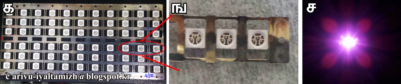 படம் 1: 450 nm அலைநீள-ஒளியை உமிழும் சில்லு, (க) விளக்குகளில் பொருத்துவதற்குமுன், (ங) சற்று பெரிதாக்கப்பட்ட உரு, (ச) ஒளி உமிழும் பொழுது.