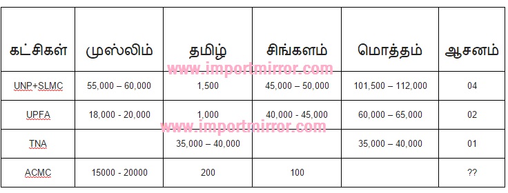 ACMC யின் அரசியல் முன்னெடுப்புக்கள் தீவிரமாக்கப்படும் சந்தர்ப்பத்தில் UPFA, SLMC + UNP (UNF) கட்சிகள் பெற்றுக்கொள்ளவிருக்கும் ஆசணத்தில் தாக்கத்தை ஏற்படுத்தலாம்