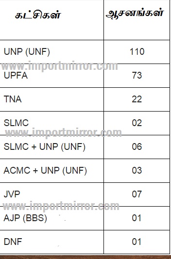 அதிகூடிய மக்கள் பிரதிநிதிகளைப் பெரும் கட்சியாக UNP (UNF) கூட்டணி பெற்று ஆட்சியமைக்கும் சாத்தியக்கூறு அதிகம் உள்ளது.