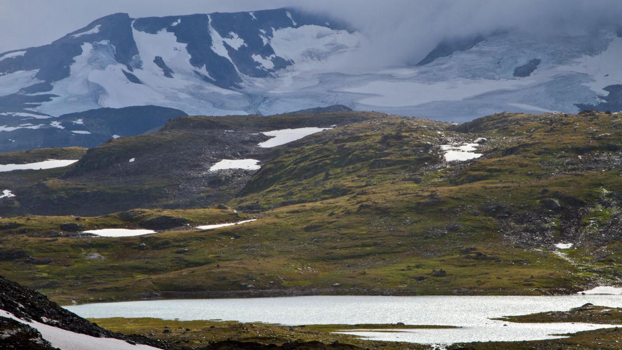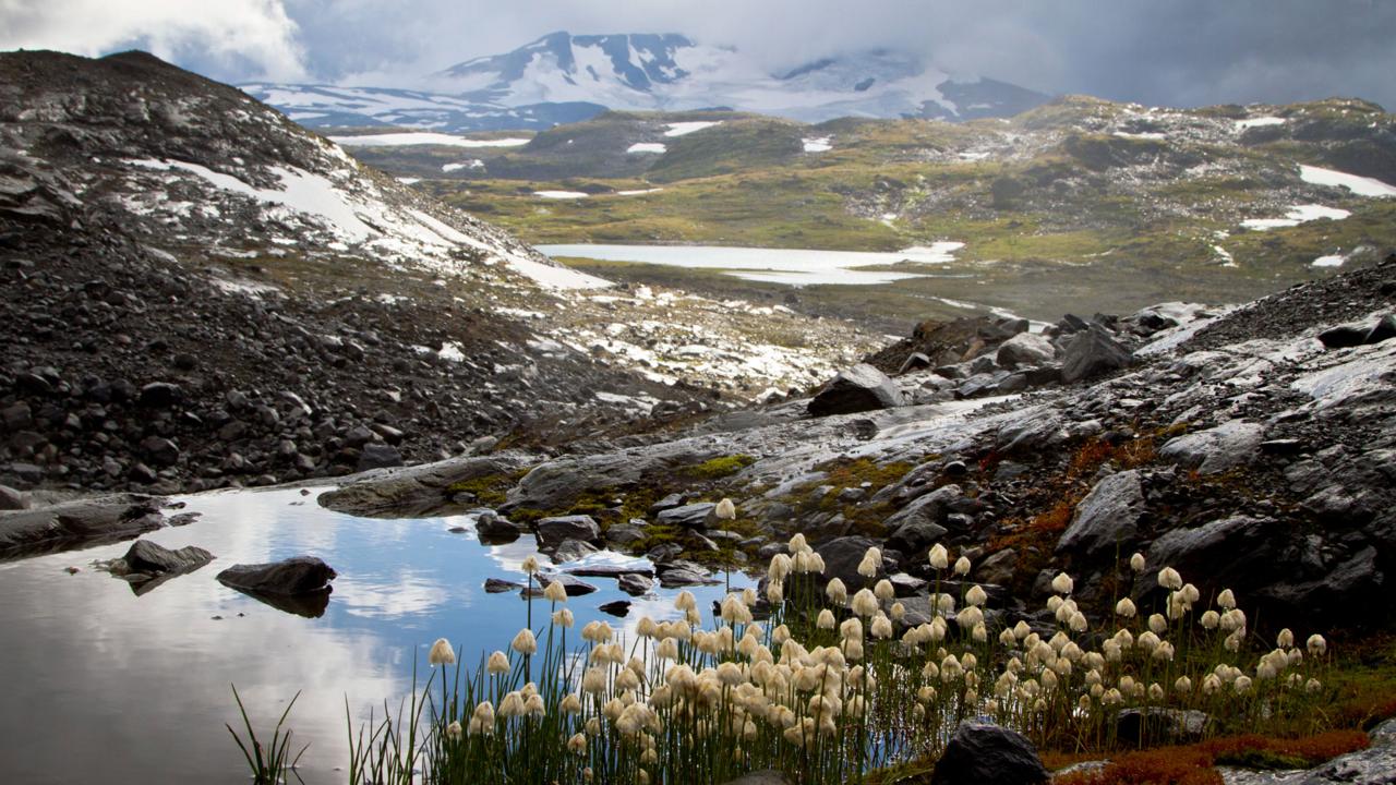 Although Jotunheimen National Park lies south of the Arctic Circle, its altitude – like much of central Norway – is high enough that a typically Arctic climate prevails and Arctic wildlife and plants dominate. Summer is very short (July to mid-August) and winter is long and hard. In the foreground of this photo, resilient flora add colour to an otherwise forbidding scene. (Credit: Stuart Butler)
