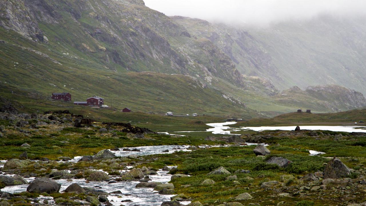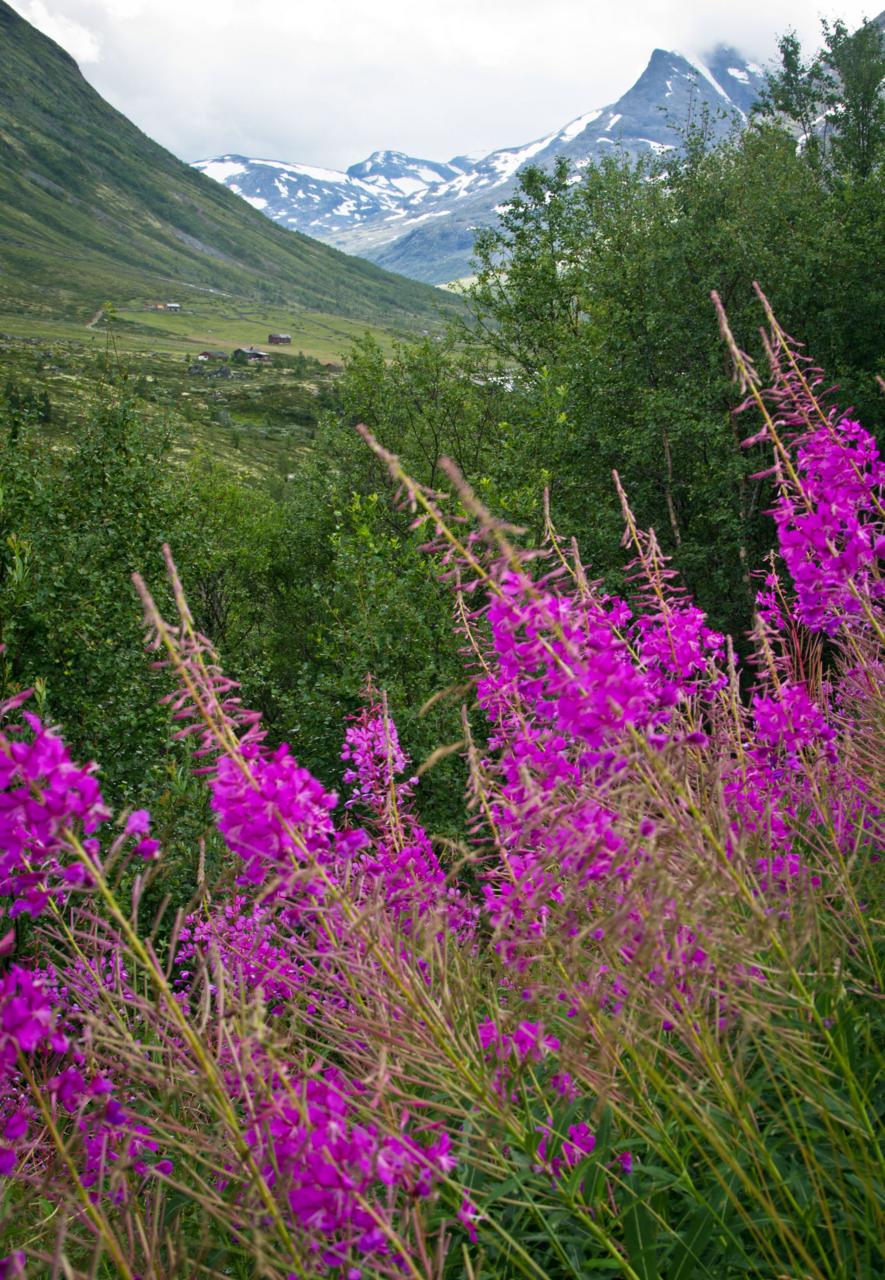 Sognefjellet Road begins tamely enough, leaving the busy mountain town of Lom and running alongside Bøver River. Gentle valley views are peppered with occasional glimpses of the high snow peaks ahead. Buried under metres of snow for much of the year, the road is only open between May and September. When I traversed the first half of the route in early August, the lowland meadows were full of purple flowers. (Credit: Stuart Butler)