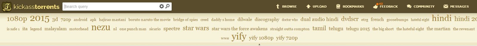 Kickass Torrents (www.kat.cr) - இன்றைய தேதிக்கு இந்தத் தளத்தை அடித்துக்கொள்ள வேறு டாரெண்ட் தளம் (Torrent Search Engine) இல்லை. பல முறை பிளாக் செய்யப்பட்டாலும் மீண்டும் மீண்டும் பீனிக்ஸ் பறவையாக எழுந்து வந்த கொண்டிருக்கிறது இந்தத் தளம். இந்தத் தளத்தின் முன்னோடிகாளானwww.thepiratebay.com , www.isohunt.com போன்ற ராட்சஸர்களையே தூக்கி சாப்பிட்டு ஏப்பம் விட்ட, அழிக்கவே முடியாத சிட்டி ரோபோ இந்தத் தளம்