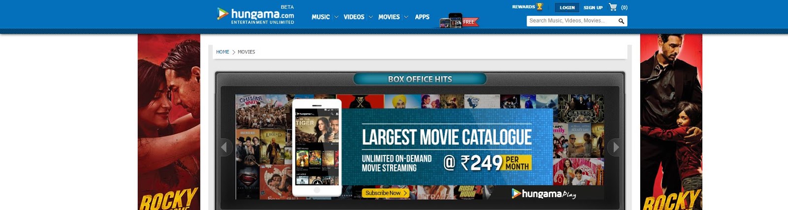 www.hungama.com - 12 இந்திய மொழிகளில் சுமார் 7000 படங்கள் இங்கு இருக்கிறது.மாதம் ரூ.249 கட்டினால் எத்தனை படங்கள் வேண்டுமானாலும் பார்த்துக்கொள்ளலாம்.