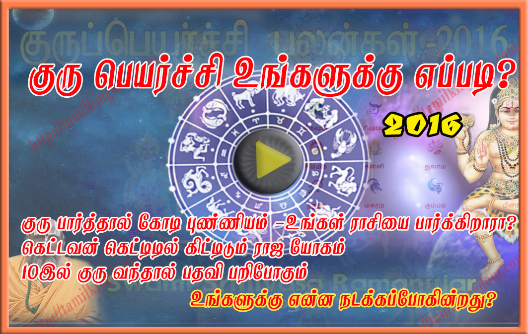 திருக்கணித பஞ்சாங்க முறைப்படி குரு பகவான் சிம்ம ராசியில் இருந்து கன்னி இராசிக்கு ஆடி 27ம் நாள், 11.8.2016 வியாழன் அன்று இரவு 9:28 மணி அளவில் பிரவேசிக்கிறார்.