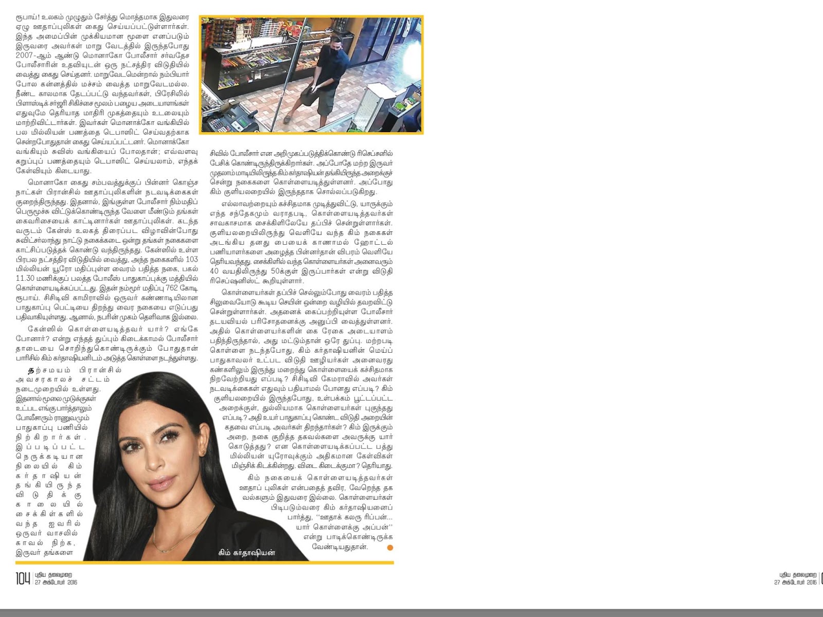 அக்டோபர் மாதம் 3ம் திகதி அமெரிக்காவின் முன்னணி தொலைக்கட்சி தொகுப்பாளரும் மாடல் அழகியுமான kim kardashian என்பவரின் பத்து  மில்லியன்  யூரோ பெறுமதியான நகைகள் பாரிஸ் நகரில் அவர் தங்கியிருந்த  நட்சத்திர விடுதியில் வைத்து கொள்ளையடிக்கப் பட்டுள்ளது.இந்திய மதிப்பிற்கு  74 கோடி ரூபாய்கள் .உலகக் கொள்ளை வரலாற்றிலேயே ஒரு தனி நபரிடம் இவ்வளவு பெறுமதியான நகைகள் கொள்ளையடிக்கப் பட்ட சம்பவம் இதுதான் . இது வரை கொள்ளையர்கள் யாரும் கைது செய்யப்படவில்லை.இவ்வளவு கச்சிதமான கொள்ளையையை நிச்சயம் ஊதாப்புலிகள் தான் செய்திருப்பார்கள் என்கிறனர் பிரெஞ்சு காவல் துறையினர் .