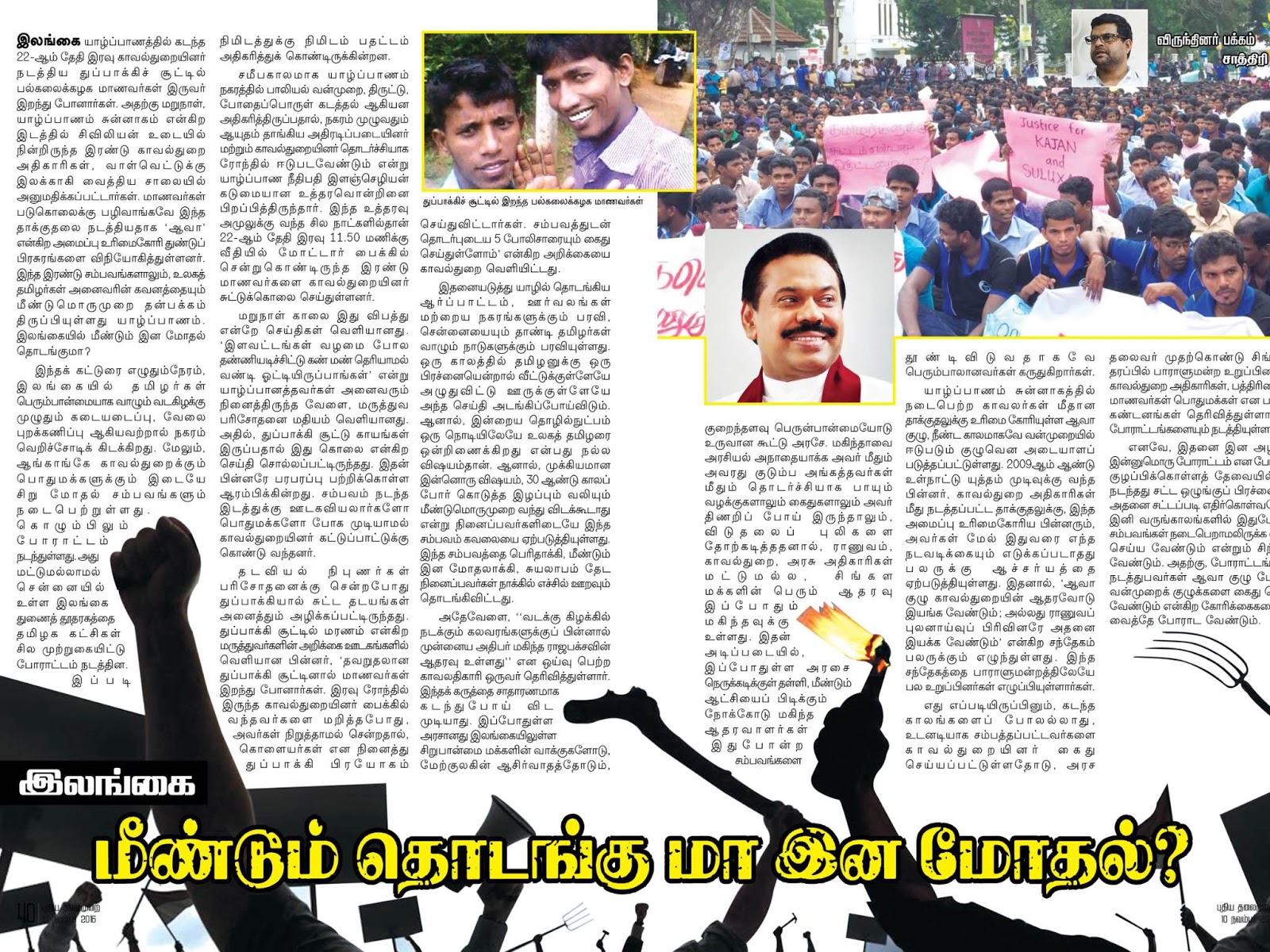 இலங்கை யாழ்ப்பாணத்தில் இம்மாதம் 22 ந் திகதி இரவு காவல்துறையினர் நடாத்திய துப்பாக்கிச்சூட்டில் பல்கலைக்கழக மாணவர்கள் இருவர் இறந்து போகிறார்கள். அதற்கு மறுநாள் யாழில் சுன்னாகம் என்கிற இடத்தில் சிவிலுடையில் நின்றிருந்த இரண்டு காவல்துறை அதிகாரிகள் வாள்வெட்டுக்கு இலக்காகி வைத்திய சாலையில் அனுமதிக்கப்படுகிறார்கள். அது மட்டுமல்ல மாணவர்கள் படுகொலைக்கு பழிவாங்கவே இந்த தாக்குதலை நடாத்தியதாக "ஆவா" என்கிற அமைப்பு உரிமைகோரி துண்டுப்பிரசுரங்களை விநியோகித்துள்ளனர்.இந்த இரண்டு செய்திகளாலும் உலகத் தமிழர்கள் அனைவரின் கவனத்தையும் யாழ் மீண்டுமொருமுறை தன்பக்கம் திருப்பியுள்ளது .