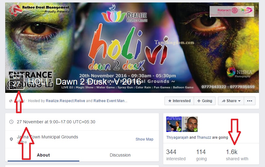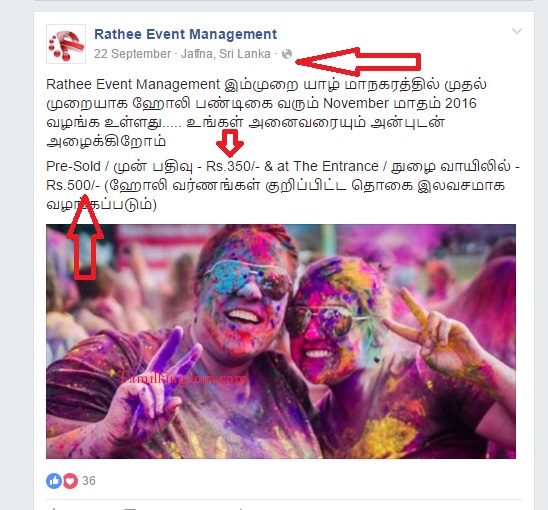 இந்த நிகழ்வுக்கான நுளைவுக்கட்டணம்  ரூபா500.00 என முன்னர் அறிவித்தல் விடுக்கப்பட்டிருந்தது தற்போது அது மாவீரர் நாழுக்கு மாற்றப்பட்டதும் நுளைவுக்கட்டணம் இலவசம் என அறிவிக்கப்பட்டு நிகழ்வில் கலந்துகொள்பவர்களுக்கு கலர் பவுடர்களும், வர்ணமழை,நீர்விளையாட்டு என அவர்களின் அறிவிப்பு வந்திருக்கிறது.(அதற்கான ஆதாரம் கீழே)