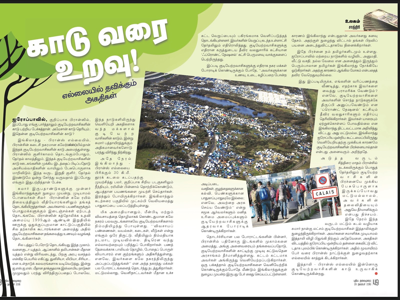 குடியேற்றவாசிகளின் காடு  அமேசன் காடு பற்றி அறிந்திருப்போம்.இதென்ன குடியேற்றவாசிகளின் காடு? இங்கிலாந்து பிரான்ஸ் எல்லையில் பிரான்சின் கடைசி நகரமான CALAIS யில் தான் குடியேற்றவாசிகளின் காடு அமைந்துள்ளது. பிரான்சில் குளிர்காலம் தொடங்கும்போதும் தேர்தல் காலத்திலும் இந்த குடியேற்றவாசிகளின் காடு  ஊடகங்களின் முக்கிய இடத்தைப் பிடிப்பதோடு அரசியல் வாதிகளின் வாயிலும் பேசுபொருளாக மாறிவிடும்.இந்த வருட இறுதி குளிர்,தேர்தல் இரண்டுமே ஓன்று சேர்ந்து வருவதால் எங்கு பார்த்தாலும் இதே பேச்சுத்தான் .சுமார் இருபதாண்டுகளுக்கு முன்னர் இங்கிலாந்துக்குள் நுழைய முயன்று முடியாமல் போனவர்கள் சிலர் CALAIS இரயில் நிலையத்திலும் வீதியோரங்களிலும் தங்கத் தொடங்கியிருந்தார்கள்.