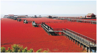 உலகின் மிக அழகான, கண்கவர் கடற்கரை எது தெரியுமா? சீனாவின் பன்ஜின் கடற்கரைதான்! கண்களுக்கு எட்டிய தூரம் வரை சிவப்புக் கம்பளத்தால் போர்த்தப்பட்டிருப்பதுபோல இந்தக் கடற்கரை காட்சியளிக்கும்! இதற்குக் காரணம், கடற்கரை முழுவதும் வளர்ந்திருக்கும் சிவப்புக் கடற்பாசிகள். பன்ஜின் நகரில் 'லியாவோஹி' ஆறு கடலில் கலக்கும் இடத்தில் கழிமுகம் உள்ளது. தண்ணீருடன் கூடிய சதுப்பு நிலப் பகுதியாக இது இருக்கிறது. ஜனவரி முதல் மார்ச் வரை மற்ற கடற்கரைகள் போலவே காட்சியளிக்கும். ஏப்ரல் இறுதியில் வசந்த காலத்தில் பச்சை வண்ணத்தில் கடற்பாசிகள் முளைக்கின்றன. 3 மாதங்களுக்குப் பிறகு, கோடைக்காலத்தில் பாசிகள் அடர் சிவப்பு வண்ணமாக மாறிவிடுகின்றன. ஆகஸ்ட் முதல் அக்டோபர்வரை உலகின் அழகிய கடற்கரையாகக் காட்சியளிக்கிறது! நவம்பர், டிசம்பர் மாதங்களில் கடற்பாசிகள் இளஞ்சிவப்பு நிறத்தை அடைகின்றன. குளிர் காலத்தில் கடற்பாசிகள் காய்ந்துவிடுகின்றன. 3 மாதங்களில் மீண்டும் கடற்பாசிகள் புதிதாக உருவாகிவிடுகின்றன. இயற்கையிலேயே கடற்பாசி சிவப்பாக மாறிவிடுவதாகச் சில ஆய்வாளர்கள் சொல்கிறார்கள். வேறு சில ஆய்வாளர்கள் இந்தக் கடற்கரை மண்ணிலுள்ள உப்பும் காரத்தன்மையுமே சிவப்பு நிறத்தைத் தருகிறது என்கிறார்கள். பன்ஜின் சிவப்புக் கடற்கரை 51 சதுர மைல் தூரத்துக்குப் பரவியிருக்கிறது. இந்தத் தனித்துவம் மிக்க அழகிய கடற்கரையை அரசாங்கம் மிகக் கவனமாகப் பாதுகாக்கிறது. அதனால் மிகக் குறைவான இடத்தை மட்டுமே சுற்றுலாப் பயணிகள் பார்ப்பதற்கு அனுமதிக்கிறார்கள். சீனாவிலிருந்தும் பிற நாடுகளிலிருந்தும் ஏராளமான சுற்றுலாப் பயணிகள் ஒவ்வோர் ஆண்டும் வருகிறார்கள். சூழலுக்குத் தீங்கிழைக்காமல் பார்ப்பதற்காக 6,500 அடி நீளத்துக்கு மரப்பாலங்கள் அமைக்கப்பட்டிருக்கின்றன. பாலத்தின் மீது நடந்து சென்று சிவப்புக் கடற்கரையை ரசிக்கலாம். புகைப்படங்கள் எடுத்துக்கொள்ளலாம். சில இடங்களில் சிவப்புப் பாசிகளுக்கு இடையே தண்ணீர் ஓடுகிறது. அங்கே படகுச் சவாரியும் நடைபெறுகிறது.