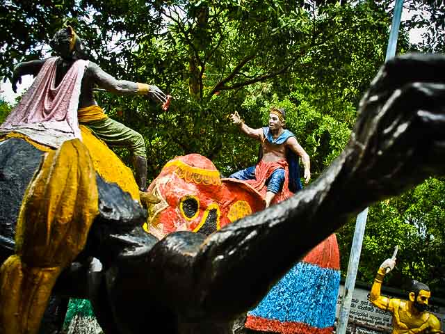 ஜா எல பகுதியில் அமைக்கப்பட்டிருக்கும் “குருகே பார்க்” எனப்படும் பொழுதுபோக்குப் பூங்கா சிறுவர்களைக் கவரும் பல விளையாட்டுக்களைக் கொண்ட ஒரு மையம். ஏராளமான பாடசாலை சிறார்களைக் கவர்வதற்காக அவர்கள் மகாவம்சக் கதைகளில் குறிப்பான சிலவற்றை சிலைகளாகவும், ஓவியங்களாகவும் பிரமாண்டமாக காட்சிப்படுத்தியிருகிறார்கள். துட்டகைமுனு – எல்லாளன் கதை அதில் முக்கியமானது. எப்போதும் போல அங்கும் எல்லாளனும், அவனது படையினரும் கருப்பாகவும் சிங்களவர்கள் வெள்ளையாகவும் காட்டப்பட்டிருக்கிறார்கள். பொதுவாக சிங்களவர்கள் மத்தியில் தமிழர்களை சித்திரிக்கும் குறியீடுகளாக நெற்றியில் விபூதி, மீசை ஆகியவற்றுடன் கறுப்புத் தோலைக் காண்பிக்கும் போக்கு நெடுங்காலமாக இருந்து வருவதை அவதானிக்கலாம்.