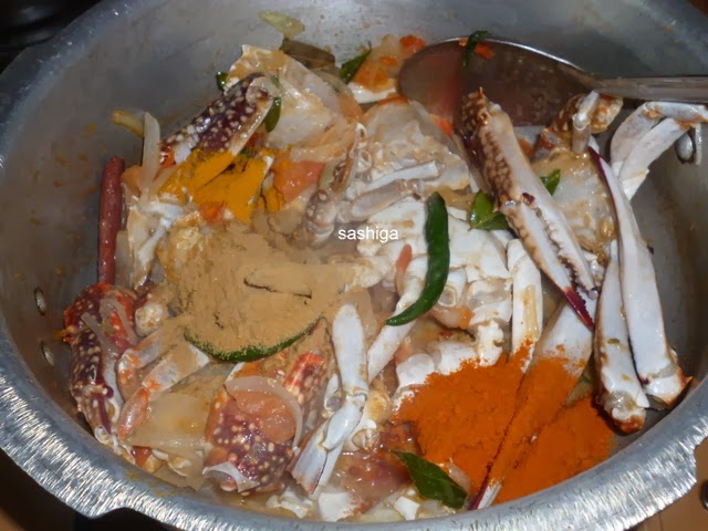 * நண்டு+தூள் வகைகள் சேர்த்து வதக்கி 1 கப் நீர் சேர்த்து கொதிக்கவைக்கவும்.