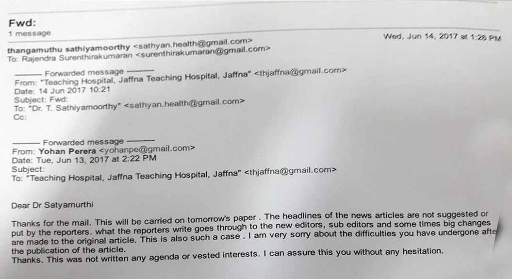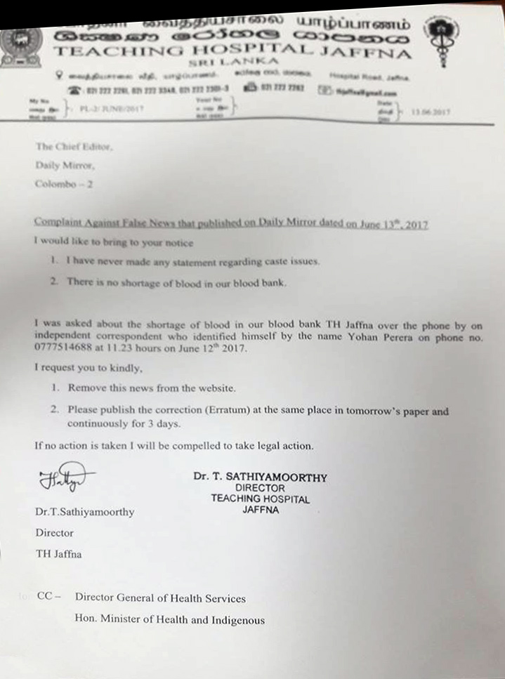 டொக்டர் சத்தியமூர்த்தி அனுப்பிய கடிதத்தில்; யொஹான் பெரேரா எனும் ஊடகவியலாளர் தொலைபேசியில் தன்னோடு இரத்தப் பற்றாக்குறை பற்றி கேட்டதாக கூறியிருக்கிறார். ஆனால் அந்த செய்தி பிழை என்கிறார். இரத்தப் பற்றாக்குறையும் இல்லை, சாதியப் பிரச்சினையும் இல்லை என்கிறார் அவர். மறுப்பை மூன்று நாள் தொடர்ந்து அதே முதல் பக்கத்தில் போடாவிட்டால் சட்ட நடவடிக்கை எடுப்பதாகவும் அவர் அனுப்பியிருந்த கடித்தத்தில் குறிப்பிட்டிருக்கிறார்.