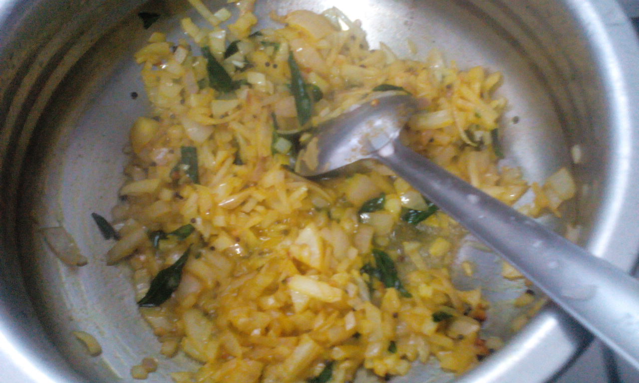 பின்பு ஒரு வாணலியை அடுப்பில் வைத்து, அதில் 3 1/2 டீஸ்பூன் தேங்காய் எண்ணெய் ஊற்றி காய்ந்ததும், கடுகு, வரமிளகாய், கறிவேப்பிலை சேர்த்து தாளித்து, பின் வெங்காயம், தக்காளியை சேர்த்து மென்மையாக வதக்கவும்.