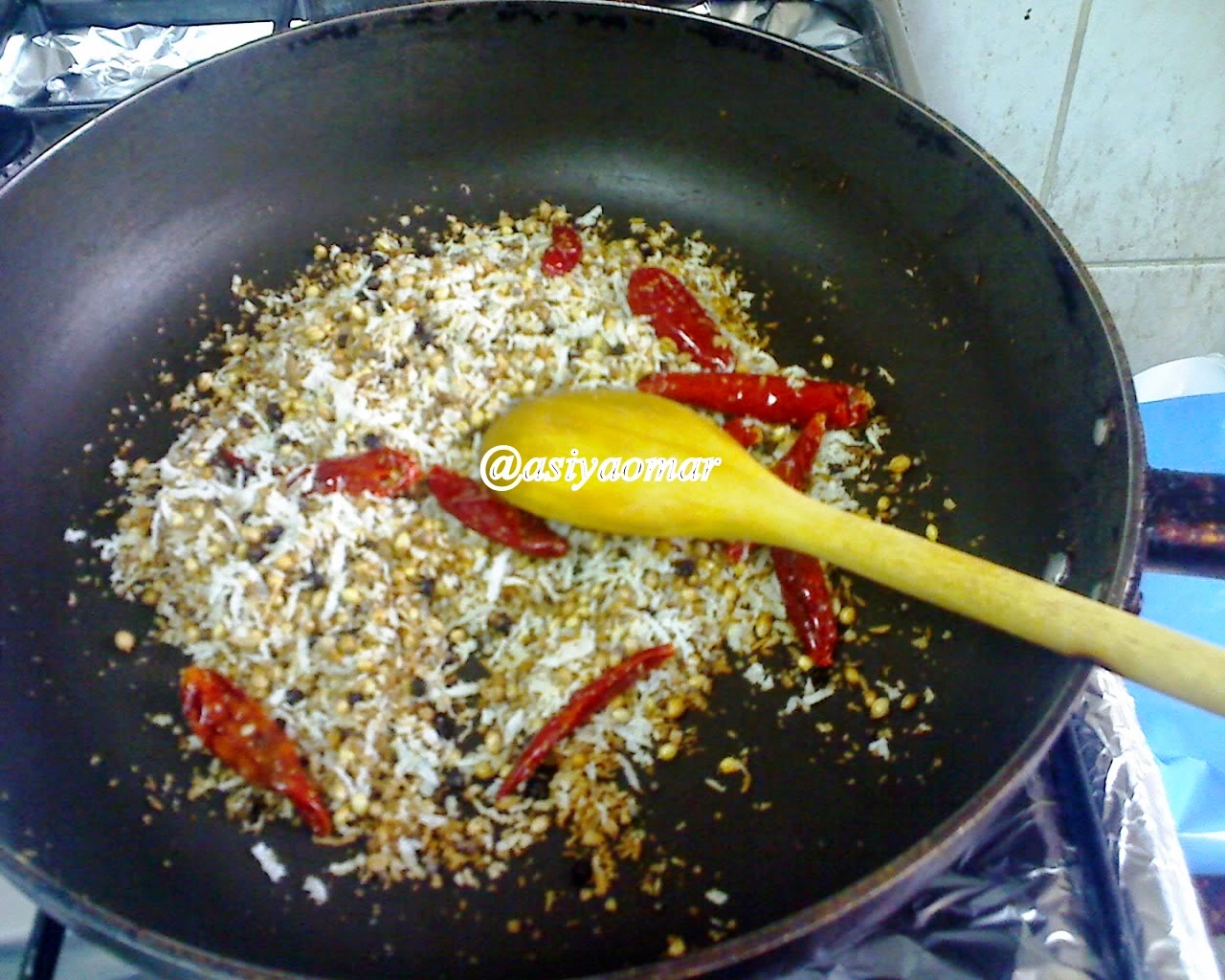 வாணலியில் காய்ந்த மிளகாய், முழுமல்லி, மிளகு, சீரகம், கடுகு,வெந்தயம், தேங்காய் துருவல் சேர்த்து இளஞ்சிவப்பாக வறுத்து எடுத்துக் கொள்ளவும்.