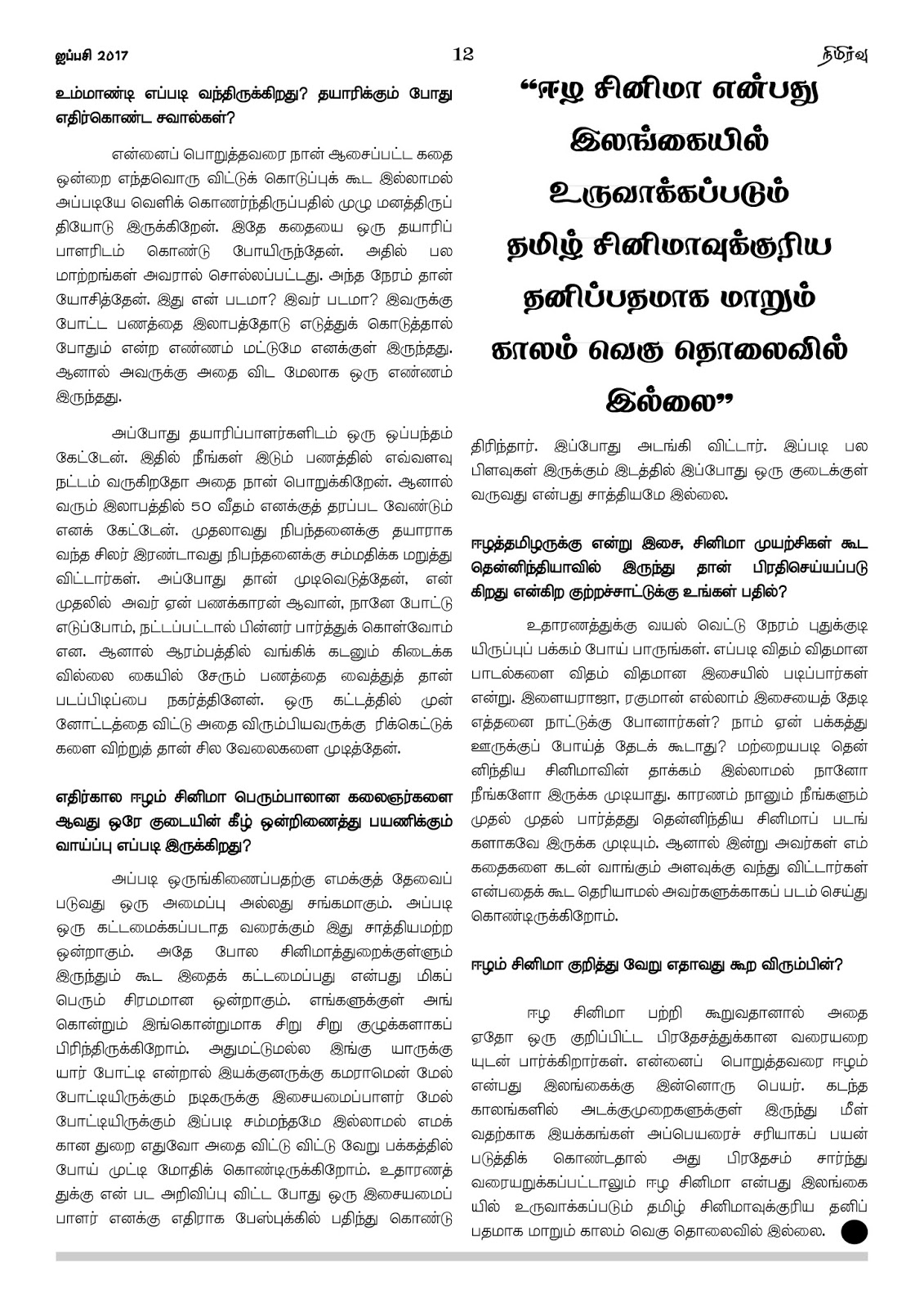 உதாரணத்துக்கு வயல் வெட்டு நேரம் புதுக்குடியிருப்புப் பக்கம் போய் பாருங்கள். எப்படி விதம் விதமான பாடல்களை விதம் விதமான இசையில் படிப்பார்கள் என்று. இளையராஜா, ரகுமான் எல்லாம் இசையைத் தேடி எத்தனை நாட்டுக்கு போனார்கள்? நாம் ஏன் பக்கத்து ஊருக்குப் போய்த் தேடக் கூடாது? மற்றையபடி தென்னிந்திய சினிமாவின் தாக்கம் இல்லாமல் நானோ நீங்களோ இருக்க முடியாது. காரணம் நானும் நீங்களும் முதல் முதல் பார்த்தது தென்னிந்திய சினிமாப் படங்களாகவே இருக்க முடியும். ஆனால் இன்று அவர்கள் எம் கதைகளை கடன் வாங்கும் அளவுக்கு வந்து விட்டார்கள் என்பதைக் கூட தெரியாமல் அவர்களுக்காகப் படம் செய்து கொண்டிருக்கிறோம்.