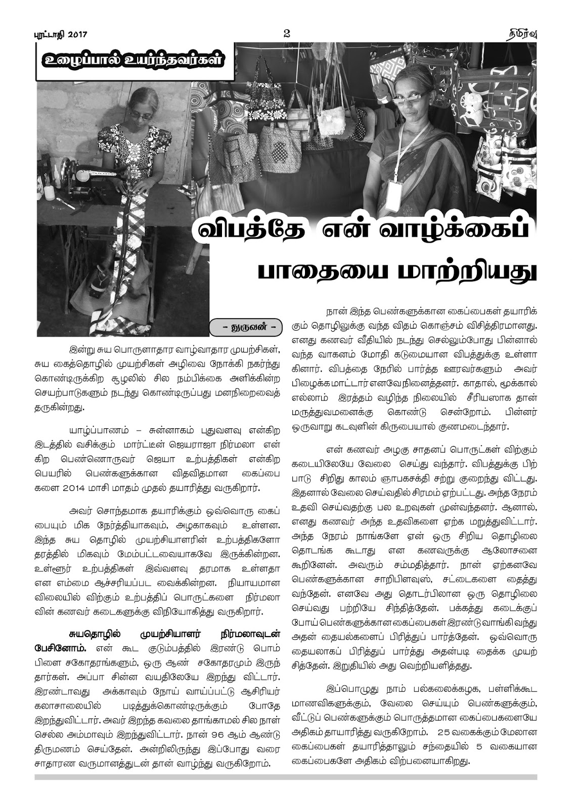 சுயதொழில் முயற்சியாளர் நிர்மலாவுடன் பேசினோம், என் கூட குடும்பத்தில் இரண்டு பொம்பிளை சகோதரங்களும், ஒரு ஆண் சகோதரமும் இருந்தார்கள். அப்பா சின்ன வயதிலேயே இறந்து விட்டார். இரண்டாவது அக்காவும் நோய் வாய்ப்பட்டு ஆசிரியர் கலாசாலையில் படித்துக்கொண்டிருக்கும் போதே இறந்துவிட்டார். அவர் இறந்த கவலை தாங்காமல் சில நாள் செல்ல அம்மாவும் இறந்துவிட்டார். நான் 96 ஆம் ஆண்டு திருமணம் செய்தேன். அன்றிலிருந்து சாதாரண வருமானத்துடன் தான் வாழ்ந்து வருகிறோம்.