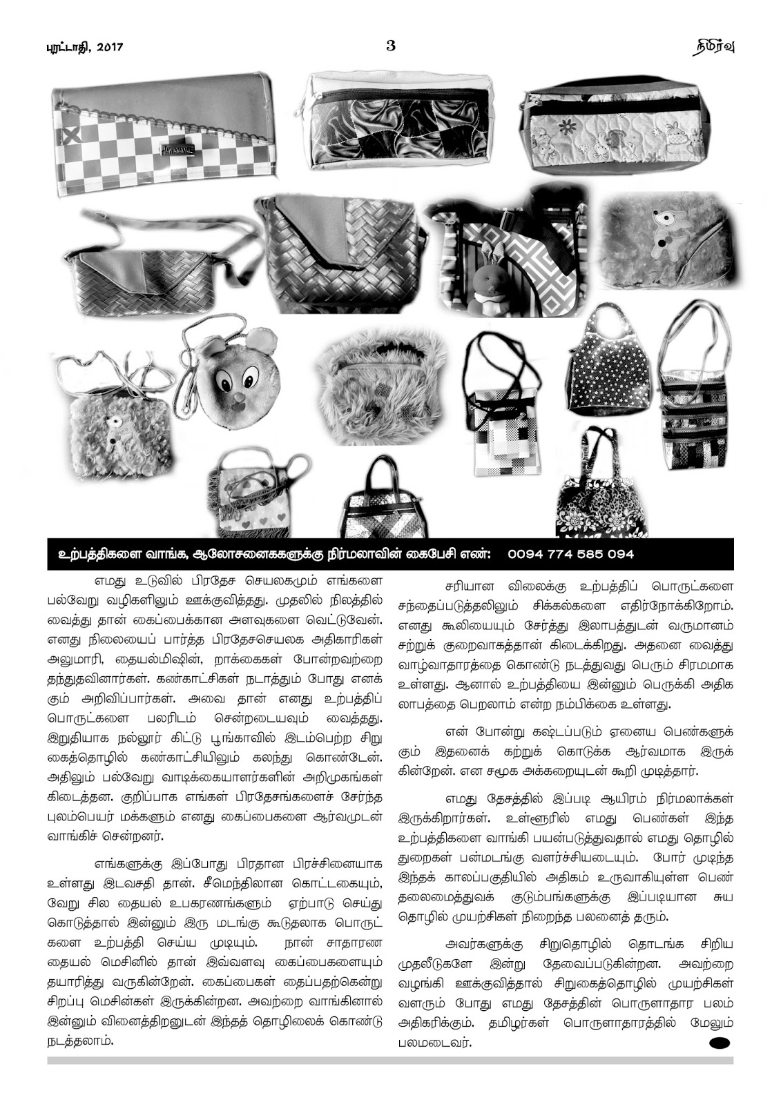 எமது தேசத்தில் இப்படி ஆயிரம் நிர்மலாக்கள் இருக்கிறார்கள். உள்ளூரில் எமது பெண்கள் இந்த உற்பத்திகளை வாங்கிப் பயன்படுத்துவதால் எமது தொழில் துறைகள் பன்மடங்கு வளர்ச்சியடையும்.