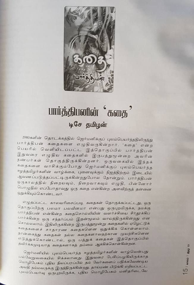 1980களின் தொடக்கத்தில் ஜேர்மனிக்குப் புலம்பெயர்ந்ததிலிருந்து பார்த்திபன் கதைகளை எழுதிவருகின்றார். 'கதை' என்ற பெயரில் வெளியிடப்பட்ட இத்தொகுப்பில் பார்த்திபன் இதுவரை எழுதிய கதைகளில் இருபத்துமூன்றை அவரின் நண்பர்கள் தொகுத்திருக்கின்றனர். ஒருவகையில் இந்தக் கதைகளை வாசிக்கும்போது ஜேர்மனிக்குப் புலம்பெயர்ந்த ஈழத்தமிழர்களின் வாழ்க்கை, புனைவுக்கும் நிஜத்திற்கும் இடையில் ஆவணப்படுத்தப்பட்டிருக்கின்றது போலத் தோன்றும். பார்த்திபன் ஒருகாலத்தில் நிறையவும், நிறைவாகவும் எழுதி, பின்னோர் பொழுதில் எப்போதாவது ஒரு கதை என்கின்ற அளவிற்கு தன்னை ஒதுக்கியும்கொண்டவர்.