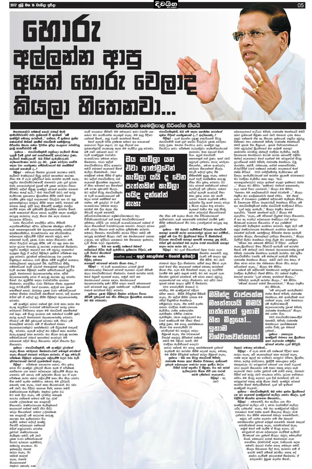 இந்தக் கதையை உறுதிப்படுத்துகின்ற விபரங்களை ஜனாதிபதி மைத்திரிபால சிறிசேன 16.07.2017அன்று “திவய்ன” சிங்களப் பத்திரிகைக்கு வழங்கிய நேர்காணல் ஒன்றில் இப்படிக் குறிப்பிடுகிறார்.
