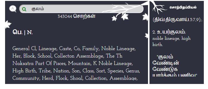 நீங்கள் :தேடிய சொற்களுக்கு  ஏற்ப பொருள்தரும் பிற சொற்களையும்,அது இடம்பெற்ற பாடல்வரிகளையும் இதில் இணைத்துள்ளார்கள். சொற்களுக்கான ஆங்கில சொற்களும் இதில் இடம்பெற்றுள்ளது.