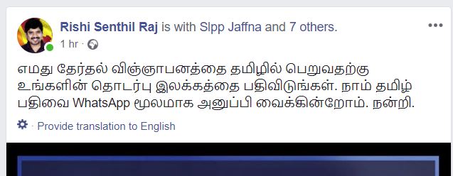கோட்டாவின் மொட்டு கட்சியைச் சேர்ந்த ரிஷி செந்தில் ராஜ் whatsapp மூலம் கோட்டாவின் தமிழ் மொழியிலான விஞ்ஞாபனத்தைப் பகிர்கிறாராம்.