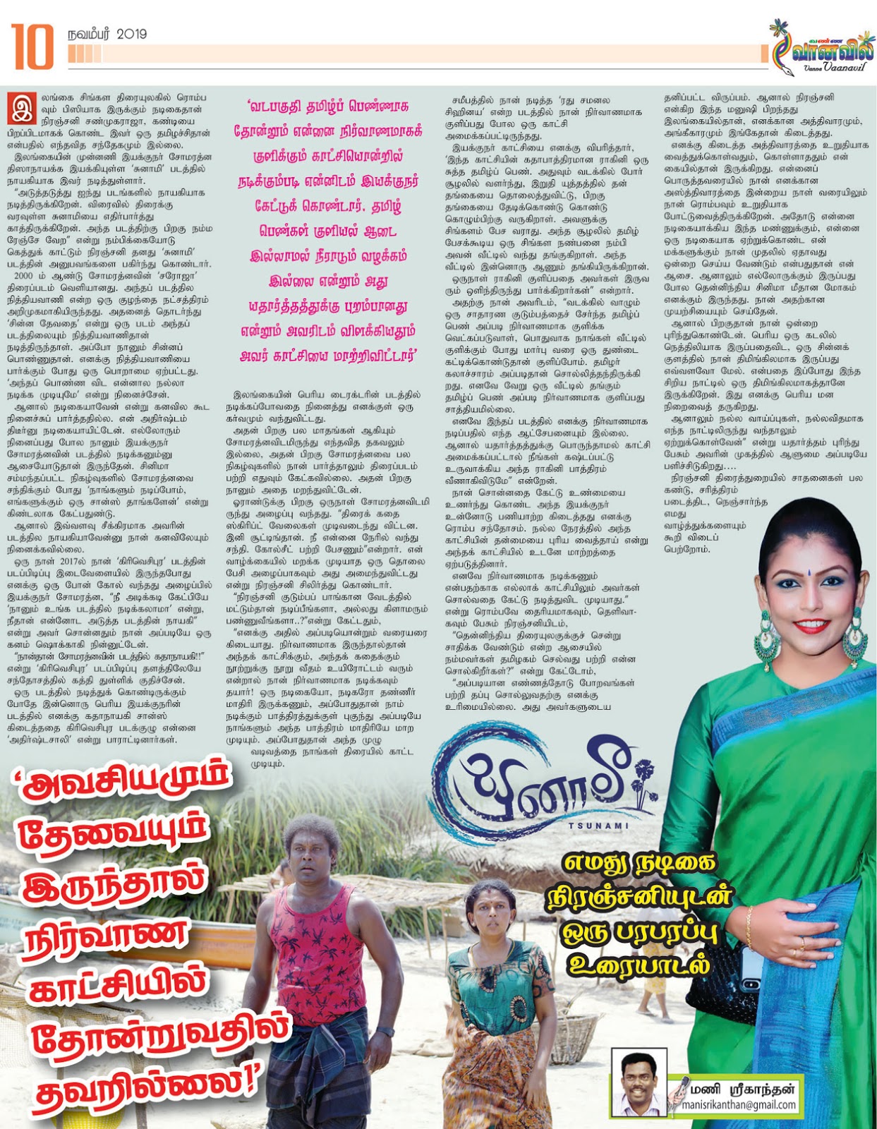 “அடுத்தடுத்து ஐந்து படங்களில் நாயகியாக நடித்திருக்கிறேன். விரைவில் திரைக்கு வரவுள்ள சுனாமியை எதிர்பார்த்து காத்திருக்கிறேன். அந்த படத்திற்கு பிறகு நம்ம ரேஞ்சே வேற” என்று நம்பிக்கையோடு கெத்துக் காட்டும் நிரஞ்சனி தனது ‘சுனாமி’ படத்தின் அனுபவங்களை பகிர்ந்து கொண்டார்.