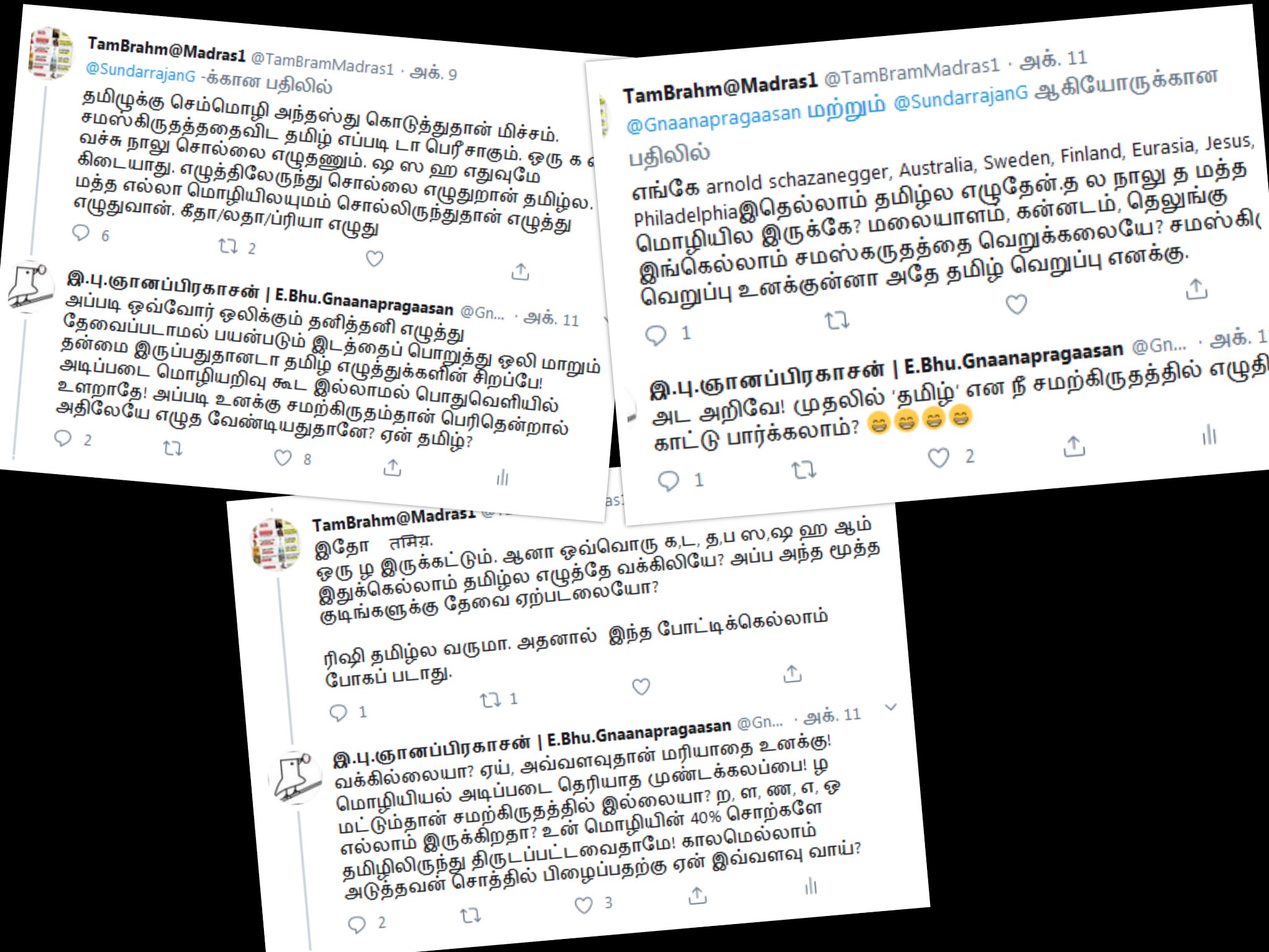 இவற்றுக்கான விடையே இப்பதிவு. ஆனால் தொடங்கும் முன், “அப்படியா கேட்டான்! தமிழையா இழித்துரைத்தான்!” என உங்கள் நெஞ்சு கொதிக்கும் இல்லையா? அதைத் தணிவிக்கும் முயற்சியாக இதோ அந்த அறிவிலிக்கு நான் தந்த எதிரடிகள் சில உங்கள் பார்வைக்கு.